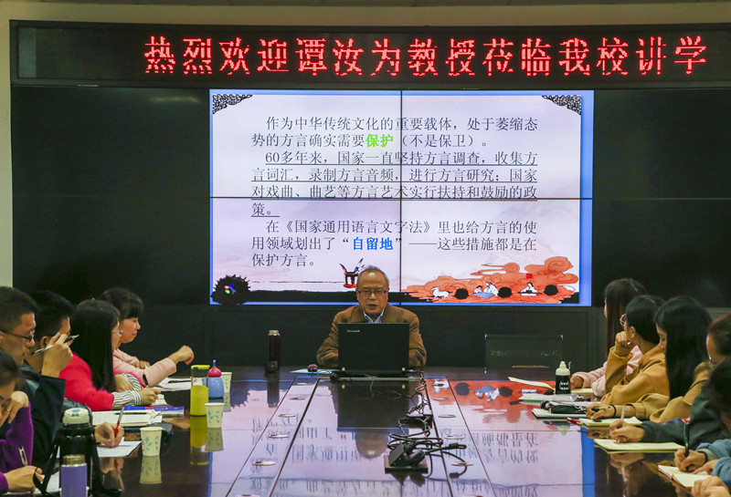 会议伊始,谭教授提到,和谐的社会语言生活应是普通话与方言和睦相处、各司其职、共同发展。谭汝为教授从事语言事业多年,有丰富的经验,谭教授认为“热爱普通话,善待方言”应是构建和谐语言生活的基本态度。普通话已成为跨越我国南北方隔阂、沟通中华民族大家庭的国家通用语言。普通话与方言虽各有长处,也各有局限,但都具有独特的实用价值、文化价值和审美价值。推广普通话,不仅使人们坚持普遍具备普通话应用能力、更使人们掌握自觉使用普通话的主体原则。推广普通话不是歧视方言,更不是消灭方言,而是消除方言隔阂。