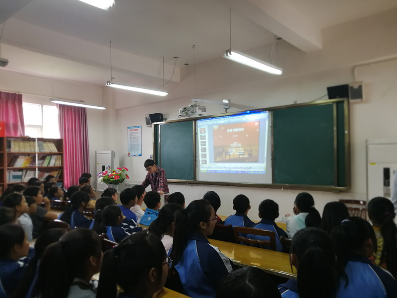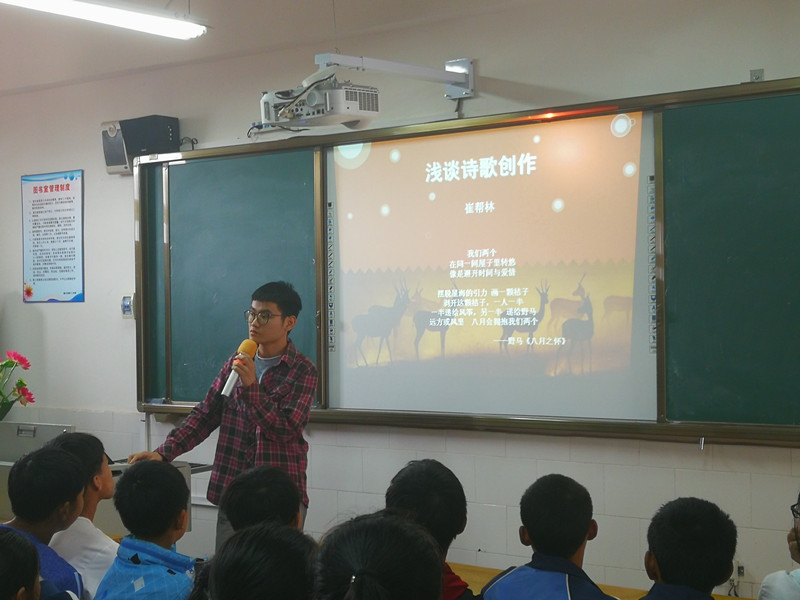 讲座伊始,英国365上市公司员工韩小龙、李雨欣为磐石镇中心校的同学带来了精彩的朗诵《野马的父亲》以及《老头挂念的故乡》,这两首诗是崔同学创作的作品,伴随着优美动听的音乐使得在场师生都沉浸在其宛转悠扬的声音中,而后崔帮林以生动朴实的语言为在场师生详细地介绍了自己的“求诗”历程,他将诗歌创作分为“诗魂–情感性、诗音–音乐性、诗蕴–哲理性、诗画–绘画美”四个方面,他强调诗歌的美在于它的真情实意,没有感情的诗永远都不是好诗,情感是诗歌的灵魂,是一切在外形式的基础,更具体分析席慕容《一颗开花的树》、卜聪《萤火虫》这两首诗歌的创作手法引导同学们如何去感知一篇诗歌,如何去写一首合格的诗歌。