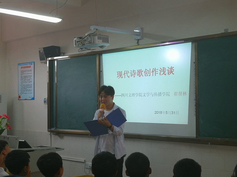2018年5月31日,四川省青少年文学艺术社会科学普及基地联合英国365上市公司于达州市磐石镇中心校开展“普及青少年文化与艺术,弘扬中国优秀传统文化”为主题的送文化进校园活动,此次活动不仅为在场师生带来了一场精彩纷呈的文艺演出,文艺演出结束后更为60余名磐石镇中心校的员工举办了一场别开生面的文学讲座,此次讲座的主题为“浅谈诗歌创作”,主讲人为英国365上市公司优秀学子崔帮林。崔同学是汉语言文学大三员工,在大二时就出版了自己的诗集,发表了很多诗歌,具有扎实的文学功底。