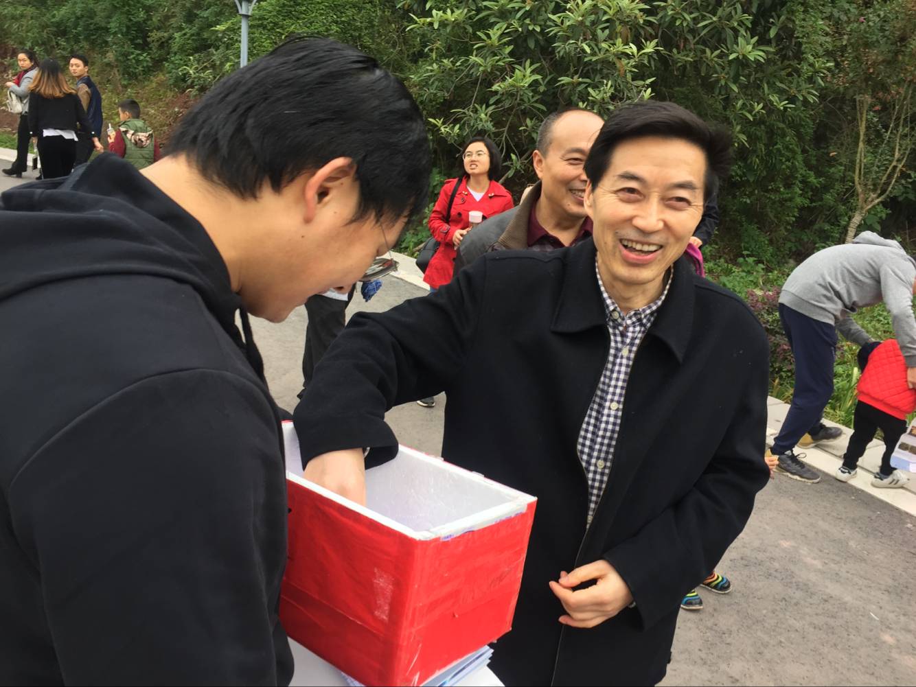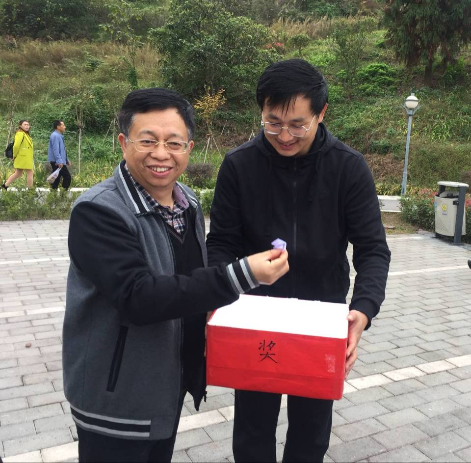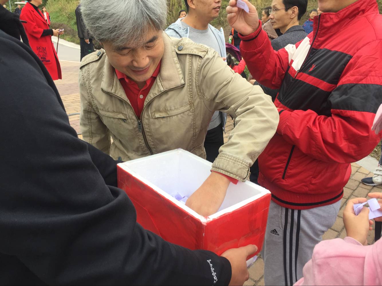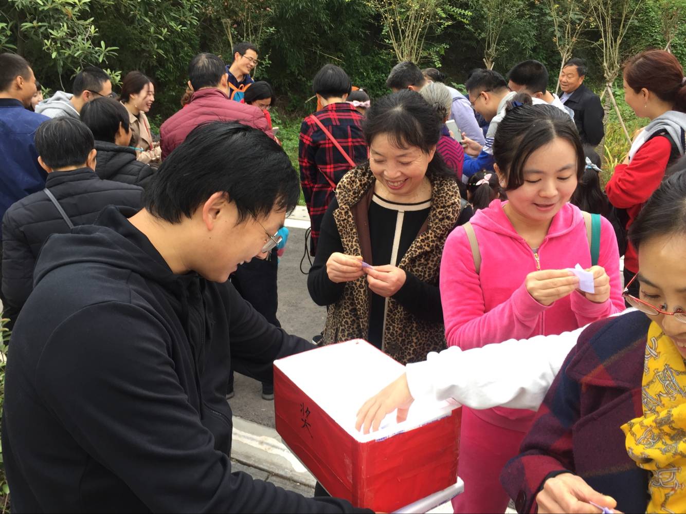 走到一处开阔的地方,把老师们聚集起来,于是由工会组长党超亿老师主持的抽奖环节开始啦。按照惯例,每个到场的老师及家属都有一次机会,大家开开心心地从幸运箱中抽取了自己的幸运字母,并把它保存起来,准备星期一到分工会主席彭教授那里兑奖。