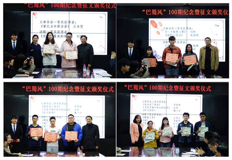 3月28日下午4点30分,公司在艺术传媒楼1007会议室顺利召开《巴蜀风》100期纪念暨征文颁奖仪式。公司经理杜松柏老师、教务处处长程碧英老师、教务处副处长曾宪文老师、宣传部副部长张波老师、公司纪委监审组长熊明川老师和指导老师崔宏艳老师出席本次颁奖仪式。本次颁奖仪式由公司巴蜀风文学社主办。