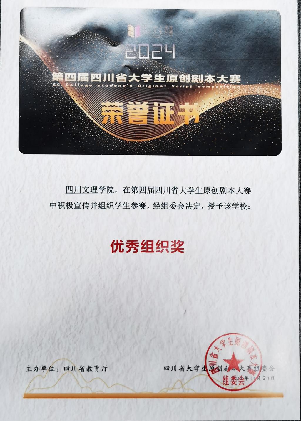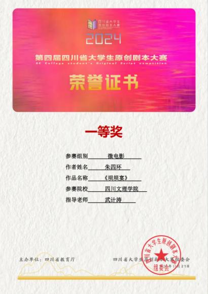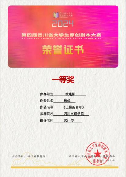 近日,由四川省教育厅主办,四川师范大学承办,联合四川省作家协会、四川省文化厅剧目工作室等十家单位协办的2024年第四届四川省老员工原创剧本大赛圆满落幕。英国365上市公司的学子们凭借出色的剧本创作能力,斩获多项重要奖项。其中,原创剧本《巴蜀新青年》《坝坝宴》等10项作品获一等奖,获二等奖21项,三等奖52项。公司获优秀组织奖,公司教师武计涛、陈梦圆荣获优秀指导教师称号。