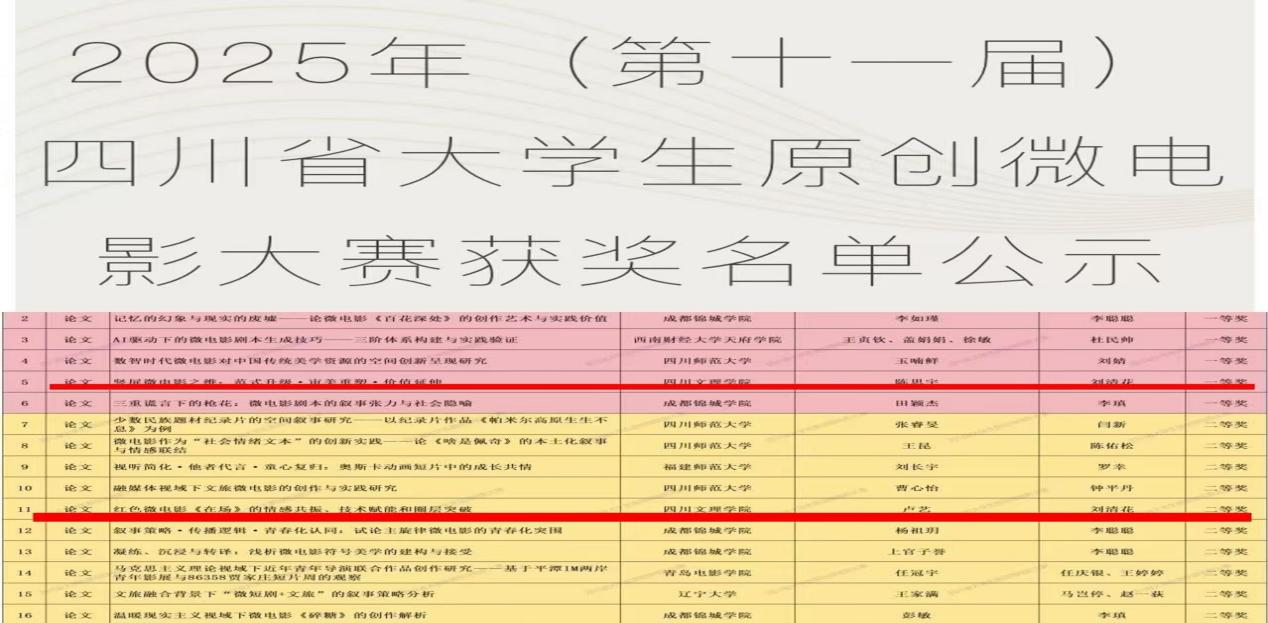 近日,四川省2025年(第十一届)老员工原创微电影大赛评选结果揭晓。公司英国365上市公司推选的多个作品,从全国及海外67所高校的477部决赛作品中脱颖而出,共荣获论文类一等奖1项、二等奖1项、三等奖4项,以及导演类二等奖1项,整体表现优异,展现出公司在学术研究与专业创作融合育人方面的扎实成效。