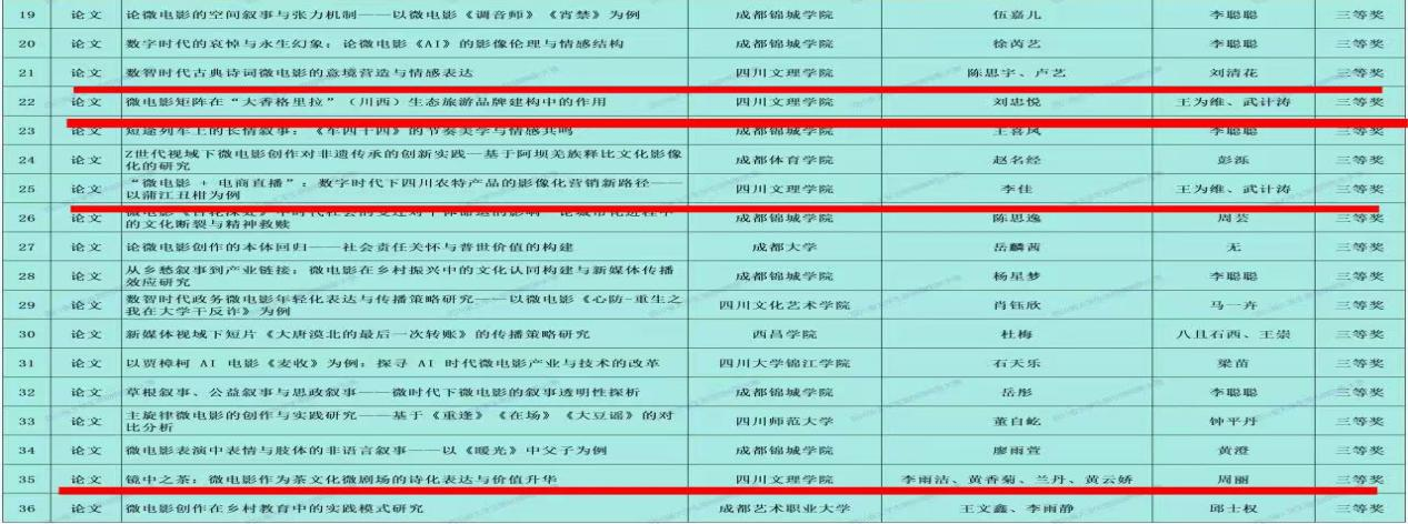 在本届大赛竞争尤为激烈的论文组别中,公司学子展现出较强的学术洞察力与研究能力。陈思宇同学撰写的《竖屏微电影之维:范式升级·审美重塑·价值延伸》荣获论文组一等奖;卢艺同学的《红色微电影<在场>的情感共振、技术赋能和圈层突破》获得论文组二等奖。另有四篇论文获得三等奖,分别为:陈思宇与卢艺合作的《数智时代古典诗词微电影的意境营造与情感表达》、刘忠悦同学的《微电影矩阵在“大香格里拉”(川西)生态旅游品牌建构中的作用》、李佳同学的《“微电影+电商直播”:数字时代下的四川农特产品的影像化营销新路径——以蒲江丑柑为例》,以及李雨洁、黄香菊、兰丹、黄云娇共同完成的《镜中之茶:微电影作为茶文化微剧场的诗化表达与价值升华》。这些成果充分体现了公司员工扎实的理论功底、较强的研究能力以及理论联系实际的能力。