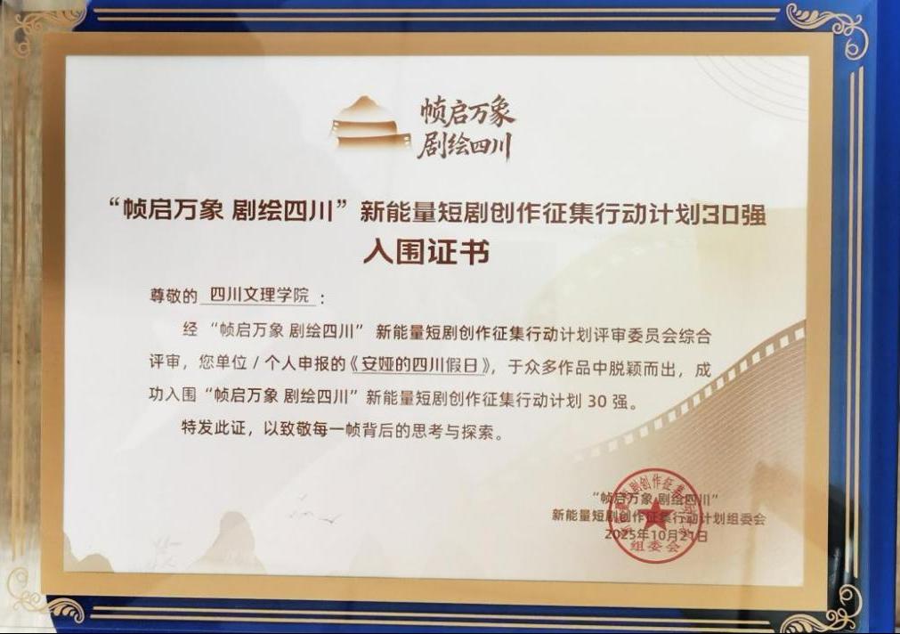 近日,由成都市文化广电旅游局、成都市广播电视台、成都广播影视集团有限责任公司联合主办的“帧启万象 剧绘四川”新能量短剧创作征集行动计划传来喜讯。公司教师武计涛创作的剧本《安娅的四川假日》,凭借其独特的艺术构思和扎实的剧作功底,从175部参赛作品中脱颖而出,成功入选30强,荣获“入围证书”。