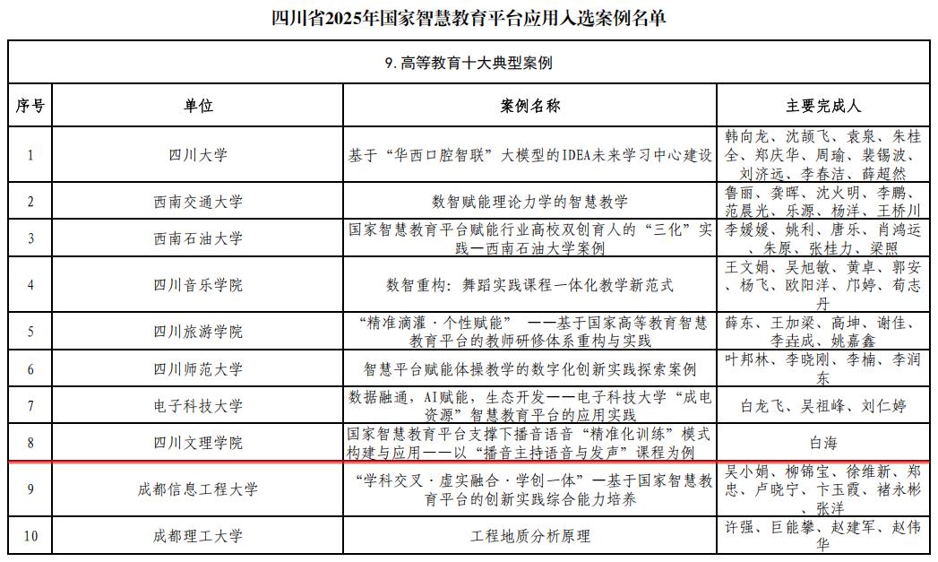 近日,四川省教育厅发布了《关于公布2025年国家智慧教育平台应用案例评选结果的通知》,公司白海教授独立完成的案例《国家智慧教育平台支撑下播音语音“精准化训练”模式构建与应用——以“播音主持语音与发声”课程为例》成功入选“高等教育十大典型案例”。