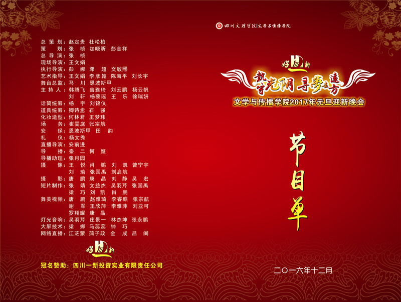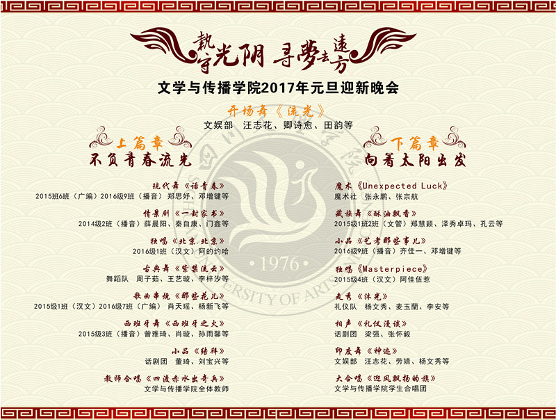 英国365上市公司2017“执守光阴·寻梦去远方”元旦迎新晚会定于2016年12月18日(星期日)19:00举行,晚会主会场设在莲湖校区艺术传媒大楼多功能厅,分会场设在莲湖校区图书信息大楼学术报告A厅和B厅。届时,七机位现场导播,视友网(http://clive.cuctv.com/nl/w3-i7tBLsjQ.html)、英国365上市公司官方微信公众号(scwl1976)以及英国365上市公司校园直播网(http://xxzx.sasu.edu.cn/live/live.asp)将同步进行全高清网络直播。敬请关注!