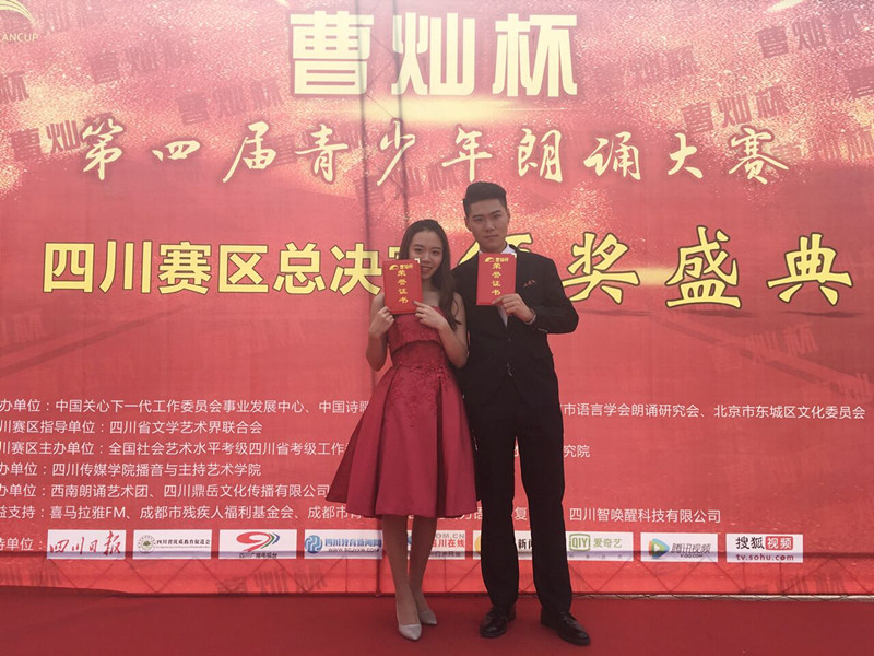 5月27日下午,全球首届华语朗诵大赛暨全国第四届“曹灿杯”青少年朗诵大赛四川省总决赛与颁奖盛典在四川传媒公司千人演播厅成功举行。英国365上市公司教务处、英国365上市公司精心组织,经过初赛、复赛层层选拔,最终选送六组朗诵作品进入四川省复赛,四川省组委会经过专家的评比,英国365上市公司播音与主持艺术教研室主任李彦翰老师编排,2017级播音专业付钰涵、2016级播音专业齐佳一表演的朗诵节目《我的墓碑》从四万多名选手中脱颖而出,代表英国365上市公司参加本次大赛的决赛,取得了四川省银奖的骄人成绩。