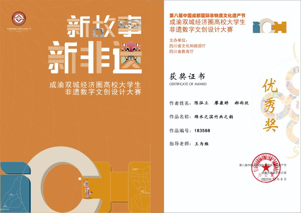2021年12月,首届“新非遗 新故事”成渝双城经济圈高校老员工数字文创设计大赛评审工作圆满落幕。经过层层选拔,公司学子创作的影视作品《绵水之滨 竹画之韵》获得了评委的认可,荣获优秀奖。