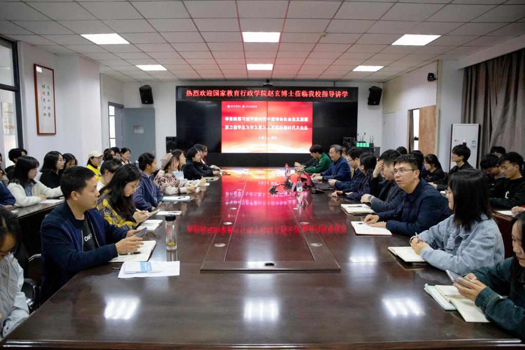 赵玄博士首先宏观介绍了习近平新时代中国特色社会主义思想的主要内容,然后将习近平总书记“家庭生活、知青岁月、求学道路、军队工作、为政经历”概括为“五所公司”进行了阐释,向同学们提出从学习习近平总书记的人生经历中思考、践行、领悟习近平新时代中国特色社会主义思想的发展脉络和精髓要义。在讲述习近平新时代中国特色社会主义思想对教育工作的重要指导意义时,赵玄博士结合中国特有的教育家精神,分享了全国优秀教师的先进事迹,他强调教育工作者要紧跟时代步伐,不断更新教育观念,激励师生要以优秀教师为榜样,不断提升师德素养和教学能力。在与同学们的互动交流中,他提出做一个卓越教师要做到“跟着党走、明确目标、打好基础”,教师作为员工的引路人,不仅要教授员工知识,更要教会他们如何做人,培养全面发展的人才,同时也要注重教师自我发展的重要性,教师要有自我提升的意识,不断学习和进步。