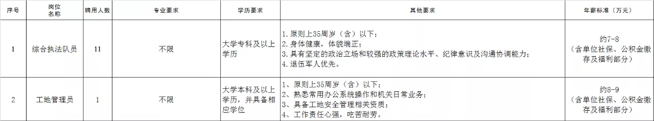 (三)招聘人数:共12名,综合执法队员岗11人、工地管理员岗1人。