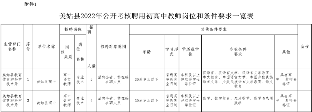 本次公开考核招聘初、高中教师180名,详细情况见附件《美姑县2022年上半年公开考核招聘初高中学教师岗位和条件要求一览表、岗位安排表》(以下简称《一览表》)。