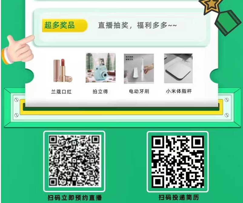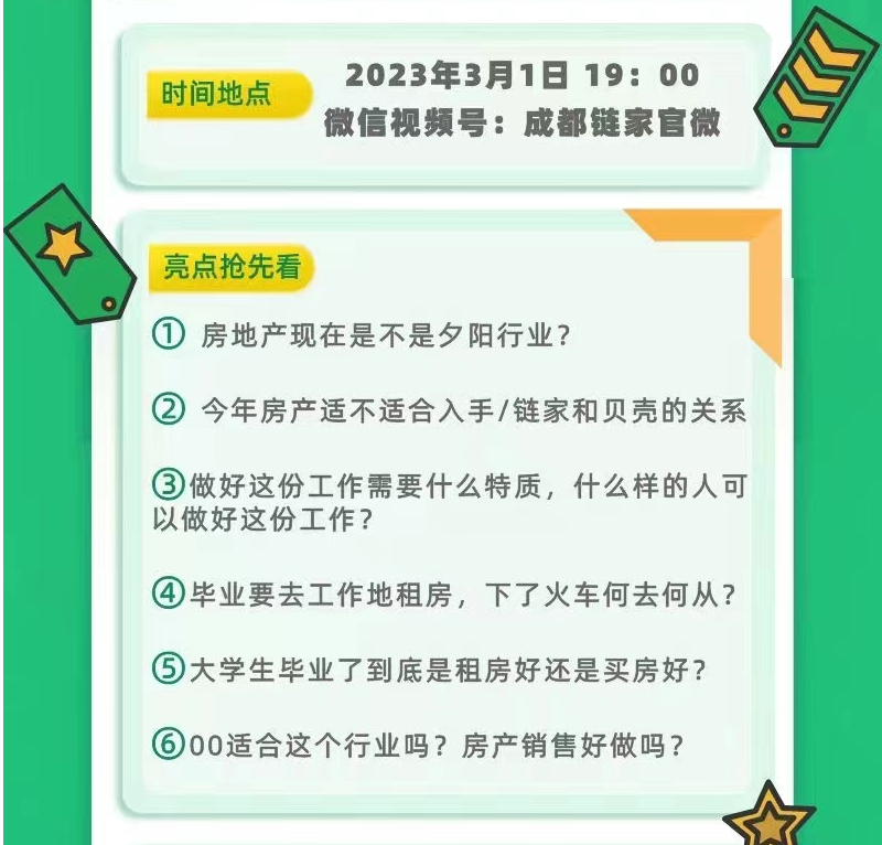 此次招聘采用“行业大拿分享+岗位引入+多轮抽奖”等方式开启对疫情后的房产行业发展全面的解析,带来不一样的招聘求职体验。直播宣讲时间:3月1日 晚19:00直播宣讲平台:成都链家官微 微信视频号平台 招聘联系人:王欢15884625883(同微信)同学们可提前扫描海报上方二维码预约参与直播(准备好简历也可以直接扫码投递)