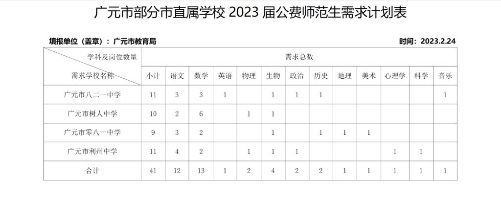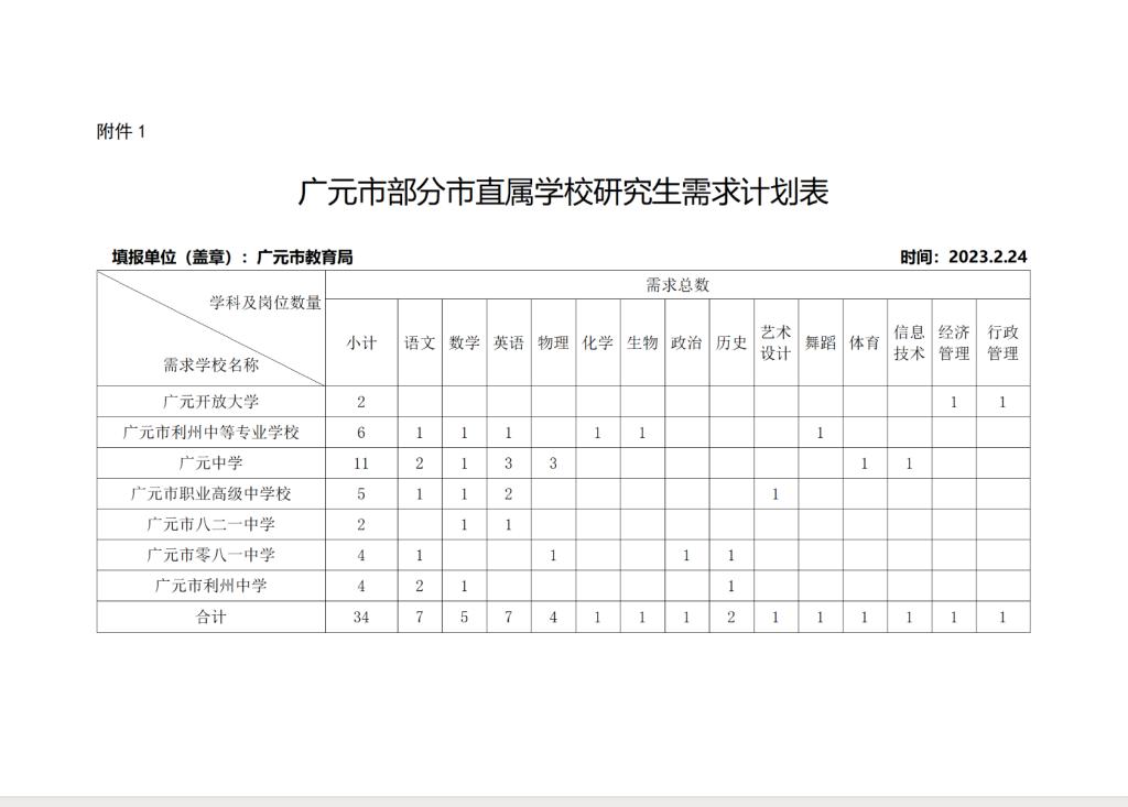 招聘要求、学科及名额详见《广元市部分市直属公司研究生需求计划表》(附件1)、《广元市部分市直属公司2023届公费师范生需求计划表》(附件2)。