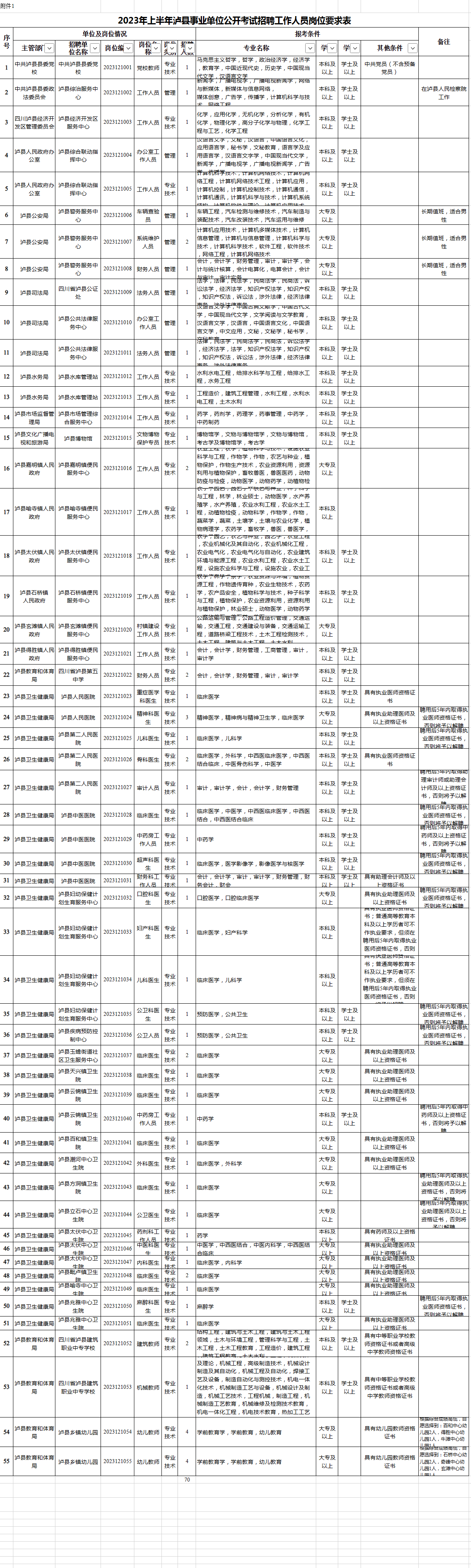 附件:附件1-2023年上半年泸县事业单位公开考试招聘工作人员岗位要求表.xls