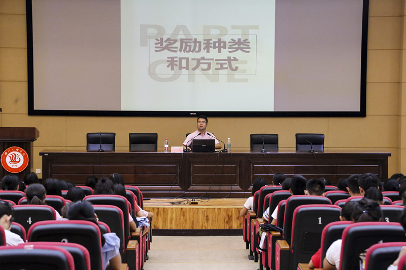 辅导员邓超老师为2017级新生解读《英国365上市公司员工奖励实施方法》,邓超老师从奖励的种类和方式、奖励条件、奖励比例和方法、评选和组织实施四个方面向同学们作了全面的讲解。奖励的种类包括个人奖励项目、集体奖励项目。包括优秀青年志愿者、优秀员工团干部、优秀道德风尚、科技型创新创业实践类奖等奖项。在奖励方式方面,公司将颁发给获得奖励的先进个人与集体授予荣誉证书和奖杯。个人评优选先应从思想情况、学习成绩、纪律处分、身体素质四个方面达标后才能进行评选,关于集体评优选先,支部人员应该认真完成公司要求的任务、无违纪违法行为、教室及寝室卫生应在良好以上、集体成员学习应该勤奋刻苦。邓超老师不仅鼓励员工在公司内参加比赛,更希望员工可以多参加校外比赛,参加国家级、省级比赛,如老员工艺术节、万峰国际微电影、省级创新创业比赛等。最后,邓超老师鼓励同学们:既要仰望星空,又要脚踏实地,把握生命的每一分钟,鲜花和掌声的背后是孤独和痛苦,没有人可以随便成功!他希望2017级新生在大学里可以思想自由、人格独立、求学上进、奋斗拼搏!