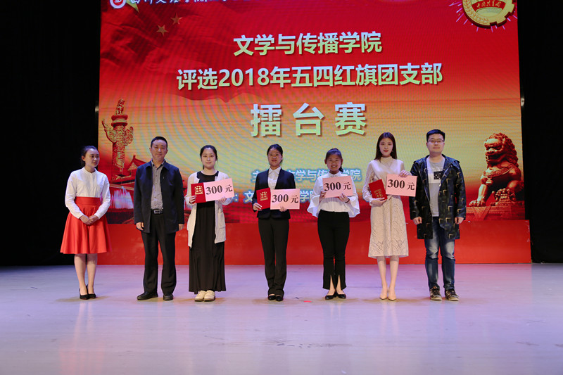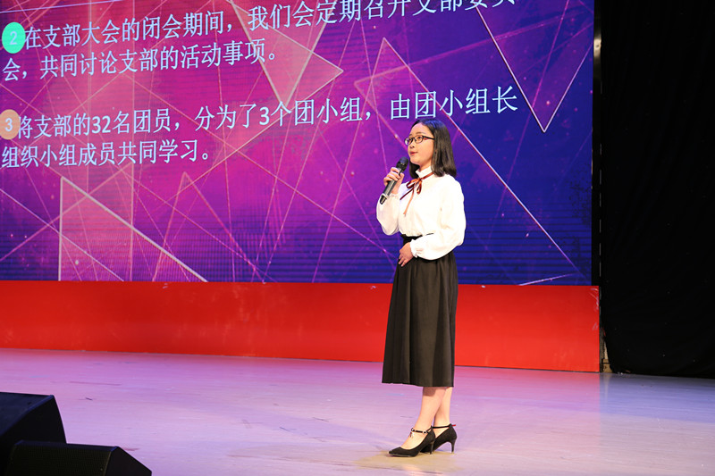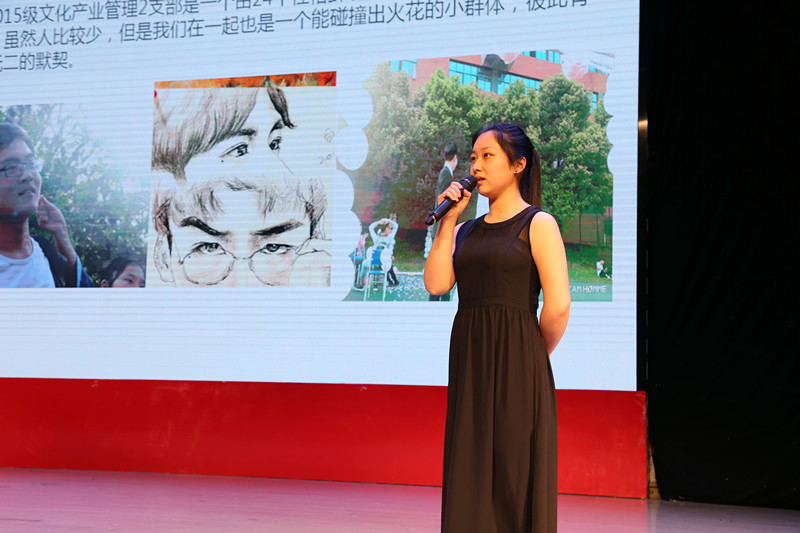 活动伊始,全体起立、奏唱团歌。接着,主持人宣读了比赛评分规则。随后,各团支部代表依次上台通过PPT展示了本支部思想建设、组织建设、学分建设、特色创新活动、集体及个人获奖情况、团结凝聚力以及对未来的展望等内容。形式多样,各具特色。“水光潋滟晴方好,最美人间四月天”,汉语言文学专业2017级3支部用动人的诗句向评委和观众展示一个充满诗意与阳光的集体,班团一体化建设使该支部在日常活动中也展现出勃勃生机;汉语国际教育专业2017级5支部以“40-1=5”作为开场,生动幽默的语言展示了他们昂然向上的风貌与积极乐观的精神;广播电视学2017级7支部用精美的PPT展示了支部日常活动的丰富多彩,展示出一个充满活力并富有团结协作精神的集体;广播电视学2016级5支部用事实说话,一幅幅图片把团员们两年来的奋斗成果清晰地呈现在银幕上;汉语言文学2017级4支部结合自身专业特点,富有创造性地开展了诗词大会、朗诵比赛、每周演讲、支教活动、户外活动等团日活动,创办了班级刊物,还对每位员工建立了个人成长档案。