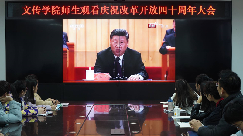 在活动中,在场的老师同学通过视频一起学习了习总书记在庆祝改革开放四十周年大会中的重要讲话。习近平总书记从10个方面回顾改革开放四十年的历程,总结了中华人民共和国在40年间的进步与不足,并指出中华人民应继续努力,不能因为暂时取得的成功而懈怠。在中国共产党领导下,中国人民成功走出一条中国特色社会主义道路。会议强调“改革开放”是我国一次伟大革命和伟大觉醒,促进了中国特色社会主义事业的飞跃发展。