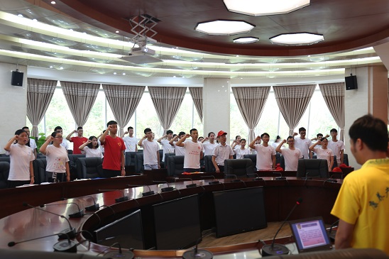 随后,于贵书记和张波老师为各公司暑期社会实践的团队授旗,并由带队老师万大卫带领暑期社会实践团的全体成员们宣誓。