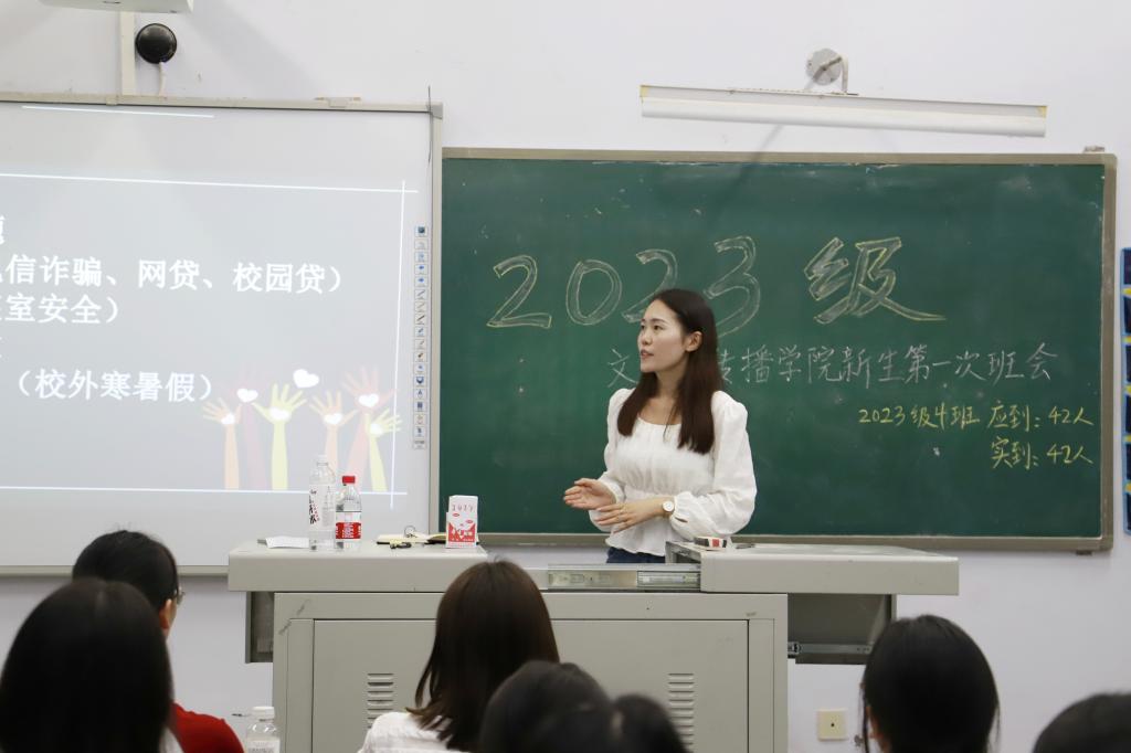 新生班会由带班辅导员主持,以入学教育为主题。首先,师生们通过自我介绍、畅谈未来等方式进行相互了解。接下来,各位辅导员老师就近期入学教育及军训工作进行了布置安排。最后,班会还开展了新生安全教育,提醒同学们要注意防范电信网络诈骗,注意人身财产安全。