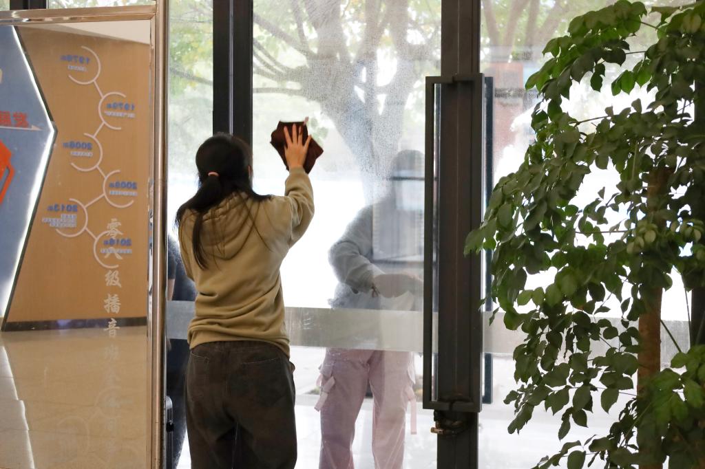 活动中,辅导员老师在艺术传媒大楼和同学们共同劳动,做出示范,师生间的互动让劳动教育变得温暖,激发起员工对劳动的参与热情。同学们分工明确,楼内擦玻璃的同学踮脚用力擦拭;楼外同学们弯腰低头捡拾垃圾。汗水挥洒间流露出同学们不怕脏、不怕累、积极奉献的劳动精神。