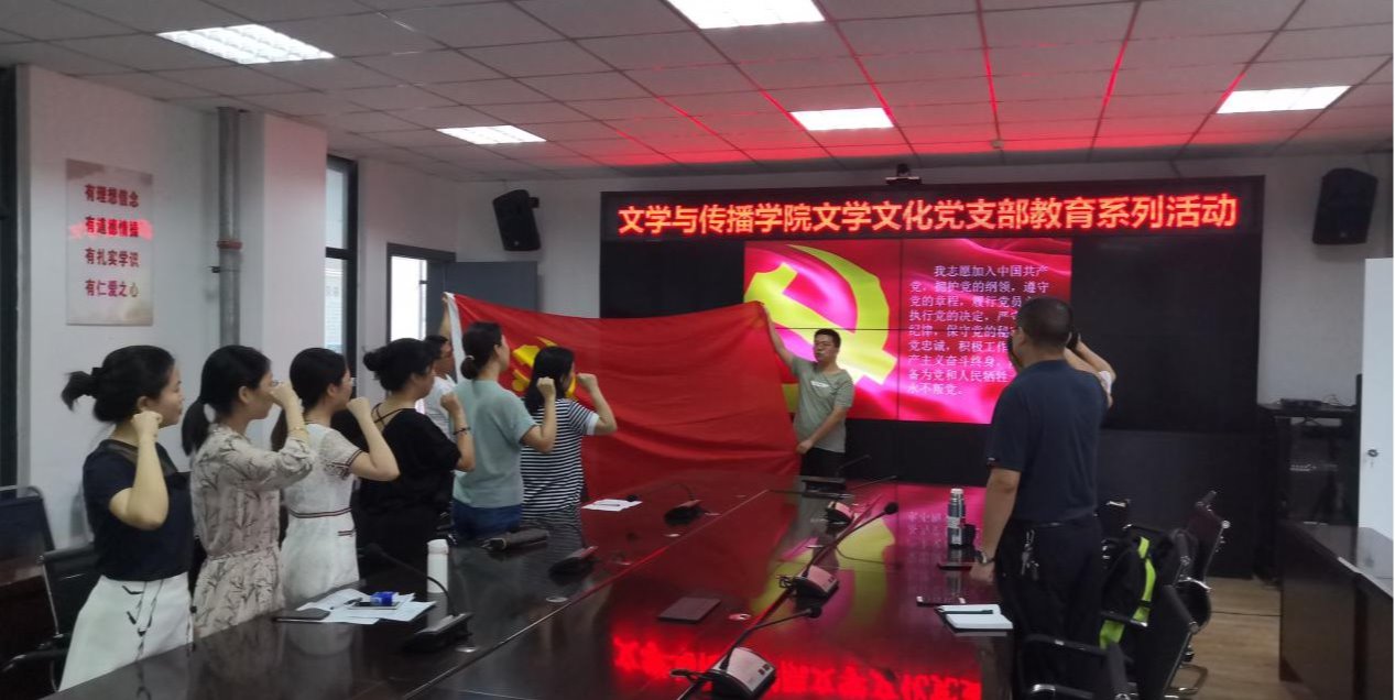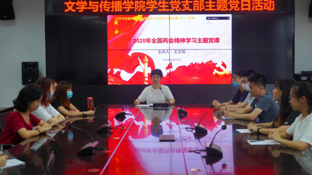 文学文化党支部根据自身实际情况,把主题党日活动、专题党课、重温入党誓词等内容结合起来。党支部书记成立围绕“2020年‘两会’精神”“习近平新时代中国特色社会主义思想”“战‘疫’凸显中国特色社会主义制度优势”等几个主题进行了宣讲。支部各党员同志就“抗疫”期间涌现出的感人事迹以及疫情期间自己的经历进行了交流和分享。