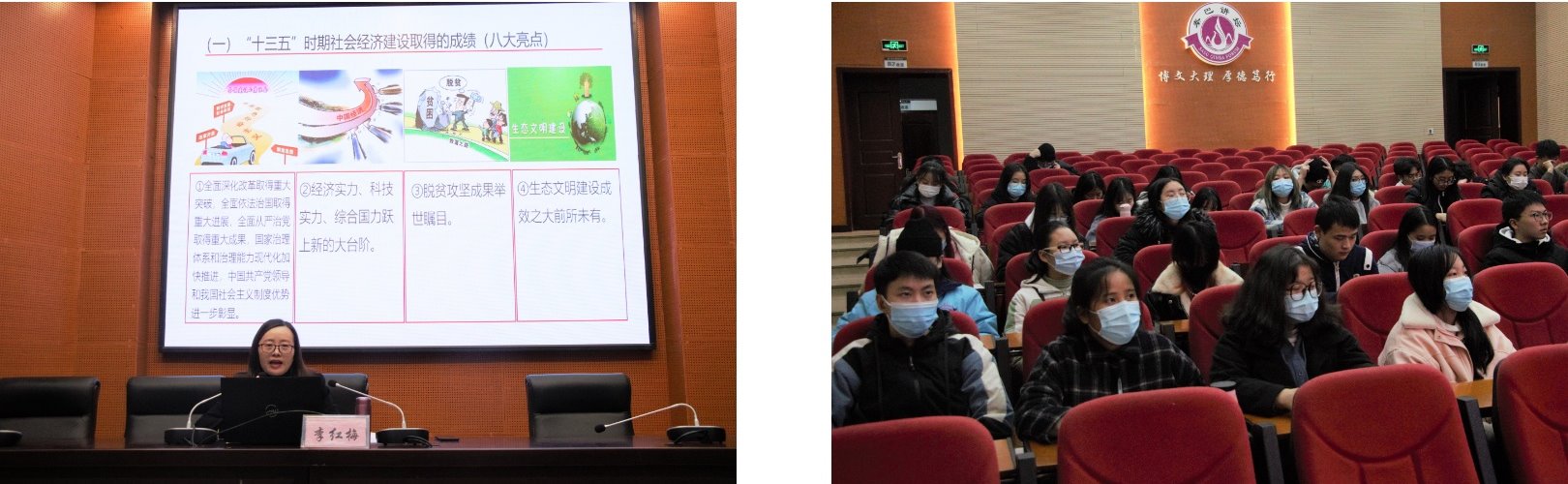 李红梅书记在讲座中就我国在“十三五”时期经济建设期间取得的成绩、党的十九届五中全会精神主要内容和做时代有为青年三方面对党的十九届五中全会精神进行了系统阐释和深入解读。根据集团的“三步走”发展战略,李书记指出,积极优化学科专业布局,改善人才培养结构,培养具有“三心四能五复合”的高素质应用型、复合型人才,把加建硕士学位授权单位作为未来五年的工作重点。她强调,实现“十四五”规划和2035年远景目标意义重大,任务艰巨,使命光荣,希望同学们做时代有为青年,紧密团结在以习近平同志为核心的党中央周围,同心同德,为全面建设社会主义现代化国家、努力成为“三心四能五复合”的高素质、应用型人才而努力奋斗。